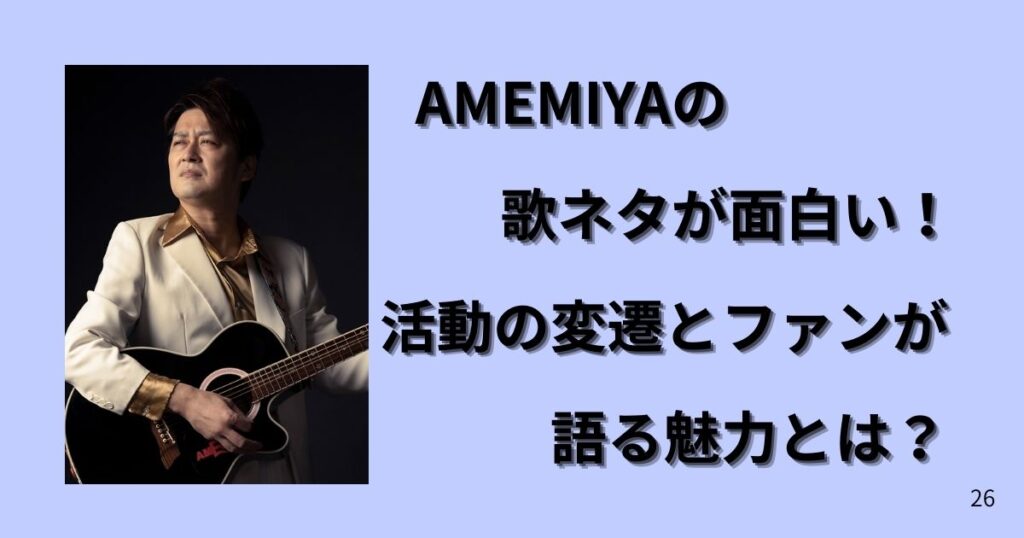 お笑い芸人兼歌手として活躍するAMEMIYA(アメミヤ)。彼のユニークな歌ネタや活動の変遷、そしてファンの熱い支持について、詳しく解説します。AMEMIYAの魅力を余すところなくお伝えしますので、笑いを求める方やAMEMIYAのファンの方々は必見です! はじ... -
